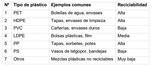 Para poder fabricar madera plástica de calidad es necesario conocer y clasificar los tipos de plástico que se recolectan. Existen diferentes categorías identificadas por un código numérico que aparece en los envases: